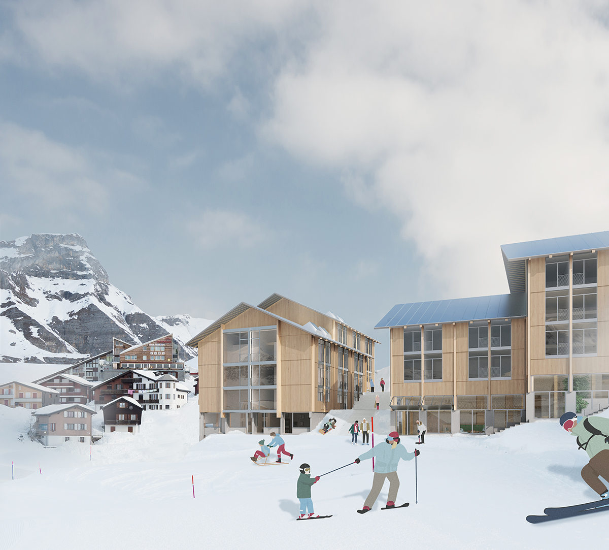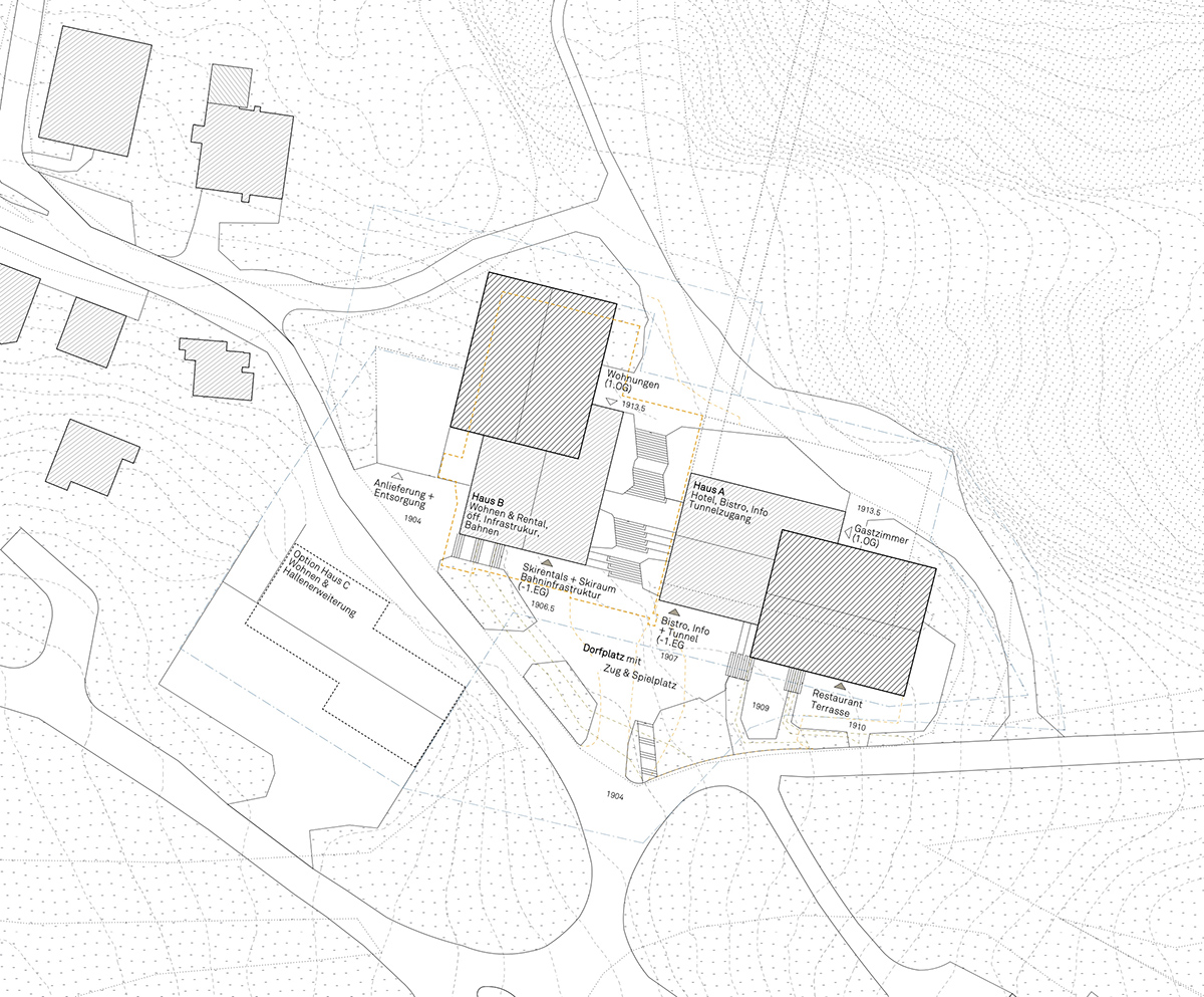 Das Projekt möchte ein Ort für alle am Berg sein, eine Art Dörfli mit Platz - im Inneren ein «Open House» zum Verweilen für Dorfbewohner, Gäste und Skifahrende. Als Holzbau konzipiert und so viel wie möglich von der alten Bausubstanz der alten Bergstation erhaltend, ist es ökonomisch und ökologisch so nachhaltig, wie ein Bau auf dieser Höhe sein kann.
