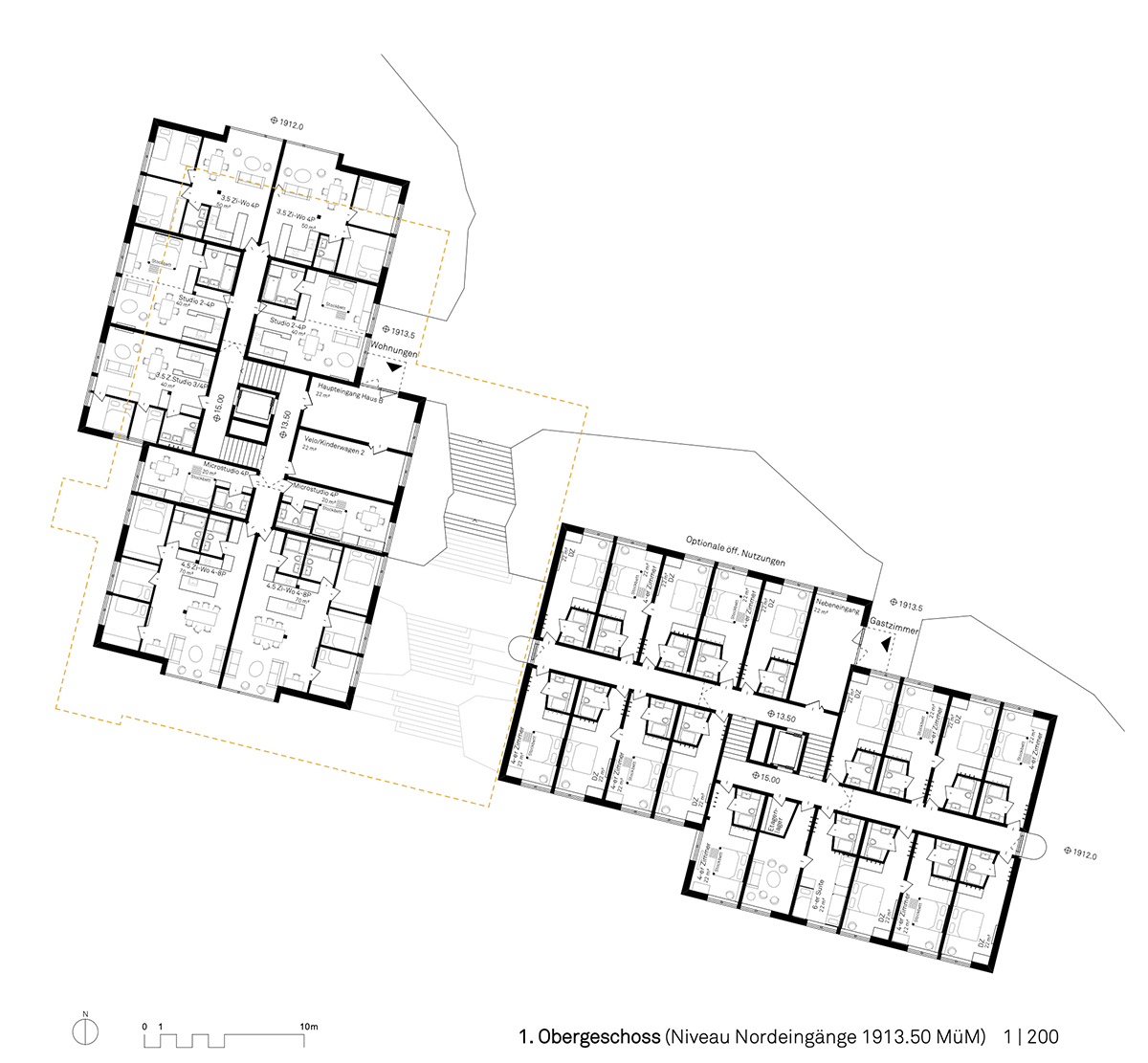 Die zwei Baukörper erinnern mit ihren Giebeldächern und Holzfassaden an traditionelle Dorfarchitektur, sind jedoch in ihrer Gestaltung sehr modern. Die Hotellerie im Inneren verfolgt ein junges, preisbewusstes Konzept, das sich an Familien und Gruppen orientiert. Wie für alle Nutzungen des „Open House“ gilt hier: Das Angebot ist eine bereichernde Ergänzung und keine Konkurrenz zu bestehenden Betrieben.