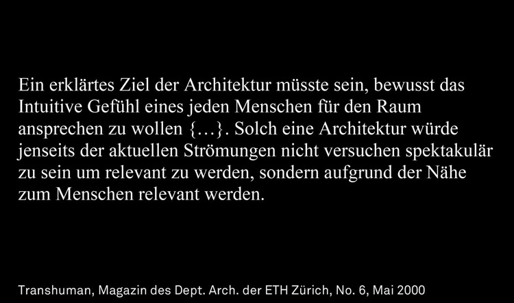 oder genau das gegenteil: warum keine architektur versuchen, die das unscheinbarste in den mittelpunkt rückt? räumliche angebote schaffen, in denen der mensch sich seiner menschlichkeit bewusst wird – miteinander.