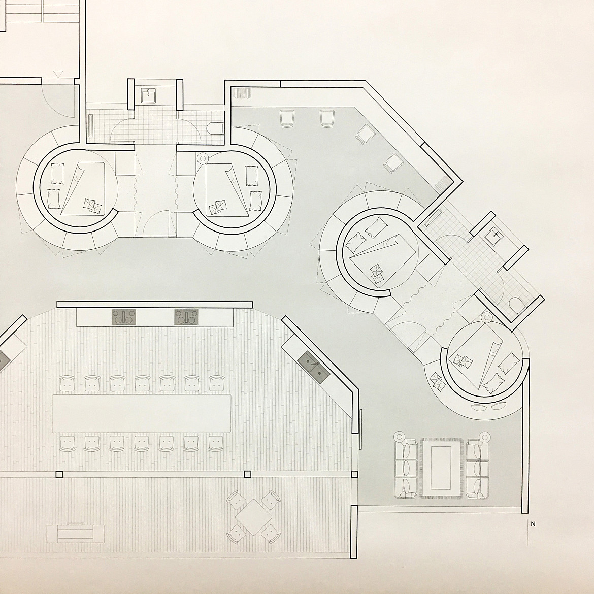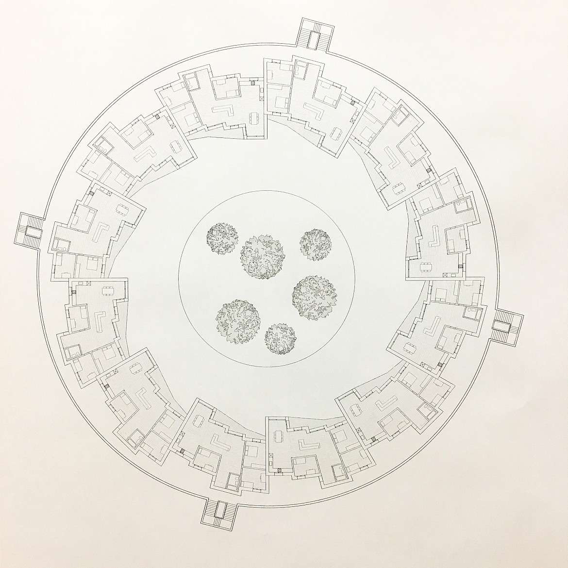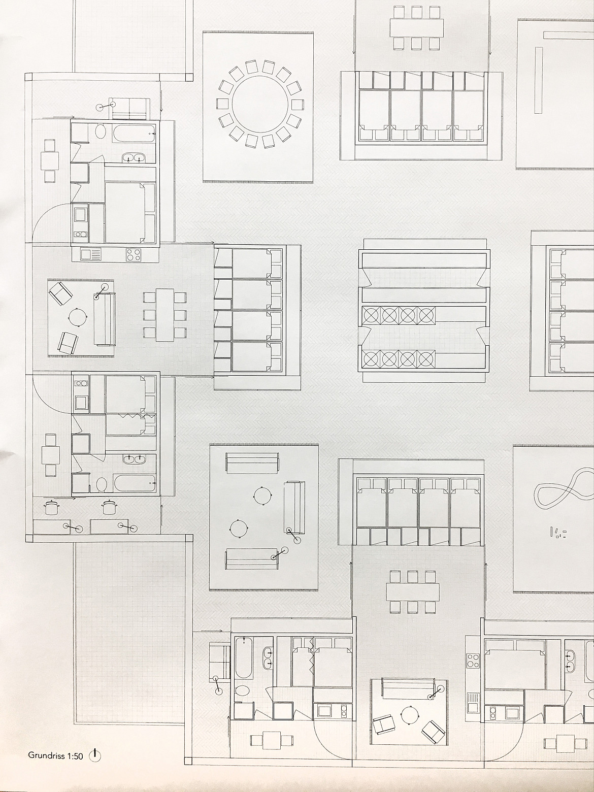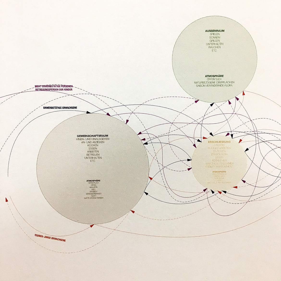 In einer ersten Übung analysierten die Studierenden das Zusammenleben und die Wohnformen einer uns möglichst fremden Gesellschaftsform: eine indigene Gruppe, zum Beispiel die Yanomami Indianer Südamerikas, der Massai in Ostafrika. In einer zweiten Übung wurde überlegt, wie deren Zusammenleben ein Vorbild für moderne Arten des verdichteten nachhaltigen Zusammenlebens bei uns sein könnten: neue Formen von Wohn- und Arbeitsgemeinschaften die bei uns funktionieren könnten, aber Wohngrundrisse benötigen, die es bisher nicht gibt. Zunächst wurde die Idee in einem Wohndiagramm notiert. In der letzten Übung in einem «passenden» Wohngrundriss umgesetzt. Enstanden sind spannende Ansätze welche die kollektive Nutzung von Infrastrukturen - vom Wohnen und Essen über das Bad bis hin zum Schlafzimmer durchdenken.