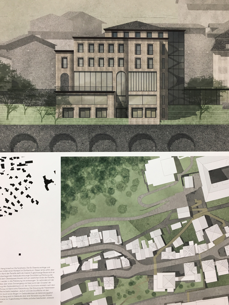 Ein Hotel im Herzen von Disentis war die Entwurfsaufgabe für das 4. Semester an der Fachhochschule Graubünden. Passend zum Leitthema "Bauen im alpinen Raum" befindet sich das Grundstück an steiler Hanglage zwischen Bahnhof und Dorfzentrum.