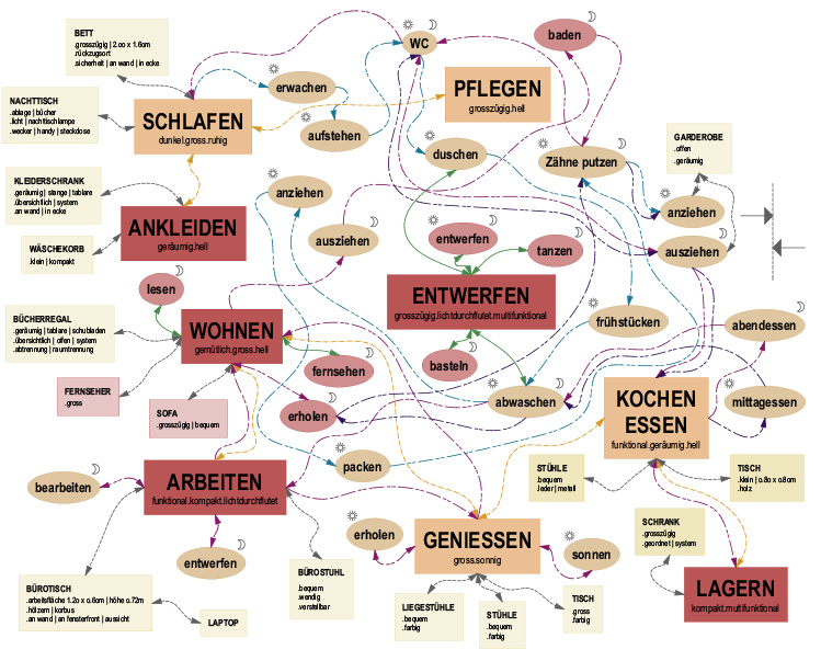Im architektonischen Entwurf beginnen wir häufig beim Städtebau , der ortsbaulichen Situation. Sind die äusseren Linien des Gebäudes einmal definiert, beginnt das „Abfüllen des Grundrisses“ mit Wohnungen. Wenn der Städtebau stimmt, die Treppenhäuser und Wohnungen funktionieren, wir überall Türen und Fenster gesetzt haben und beginnen, den Grundriss zu möblieren, merken wir: im grossen Schlafzimmer finden wir einfach keine freie Wand für den Kleiderschrank, im Kinderzimmer haben keine zwei Kinderbetten Platz und im Wohnzimmer will sich einfach keine gute, gemütliche Position für Sofa und Fernsehgerät finden. Der Kurs «Vom Möbel zum Raum» möchte daher einmal den umgekehrten Entwurfsweg gehen. Ausgangspunkt soll dabei das eigentliche Ziel einer jeden guten Wohnung sein: das Wohlbefinden und der persönliche Handlungsspielraum eines Menschen. In einer ersten Übung werden wir unsere persönlichen Erfahrungen mit Wohnmöbeln analysieren und daraus allgemeine Anforderungen an Möbel und Raum ableiten. In einer zweiten Übung wird unser Wohnen, seine Abläufe und Handlungen, in einem Wohndiagramm als Ganzes analysiert und optimiert. In der letzten, dritten Übung sollen die Erkenntnisse aus den vorhergehenden Übungen in einem "idealen" Wohngrundriss zur Anwendung gebracht werden.