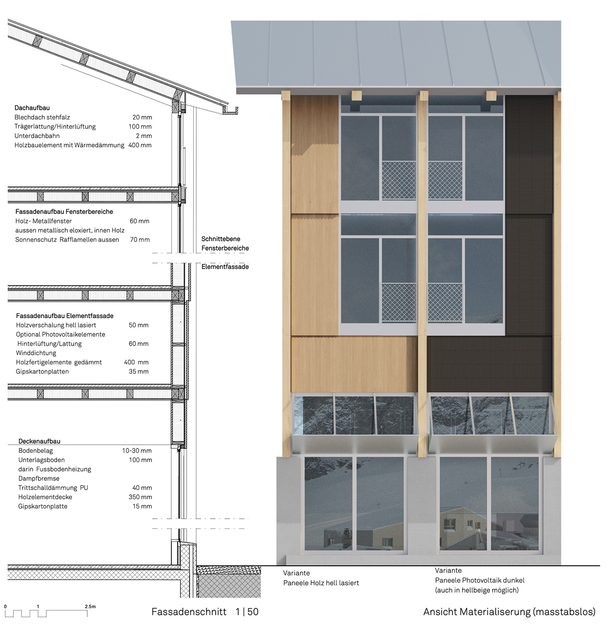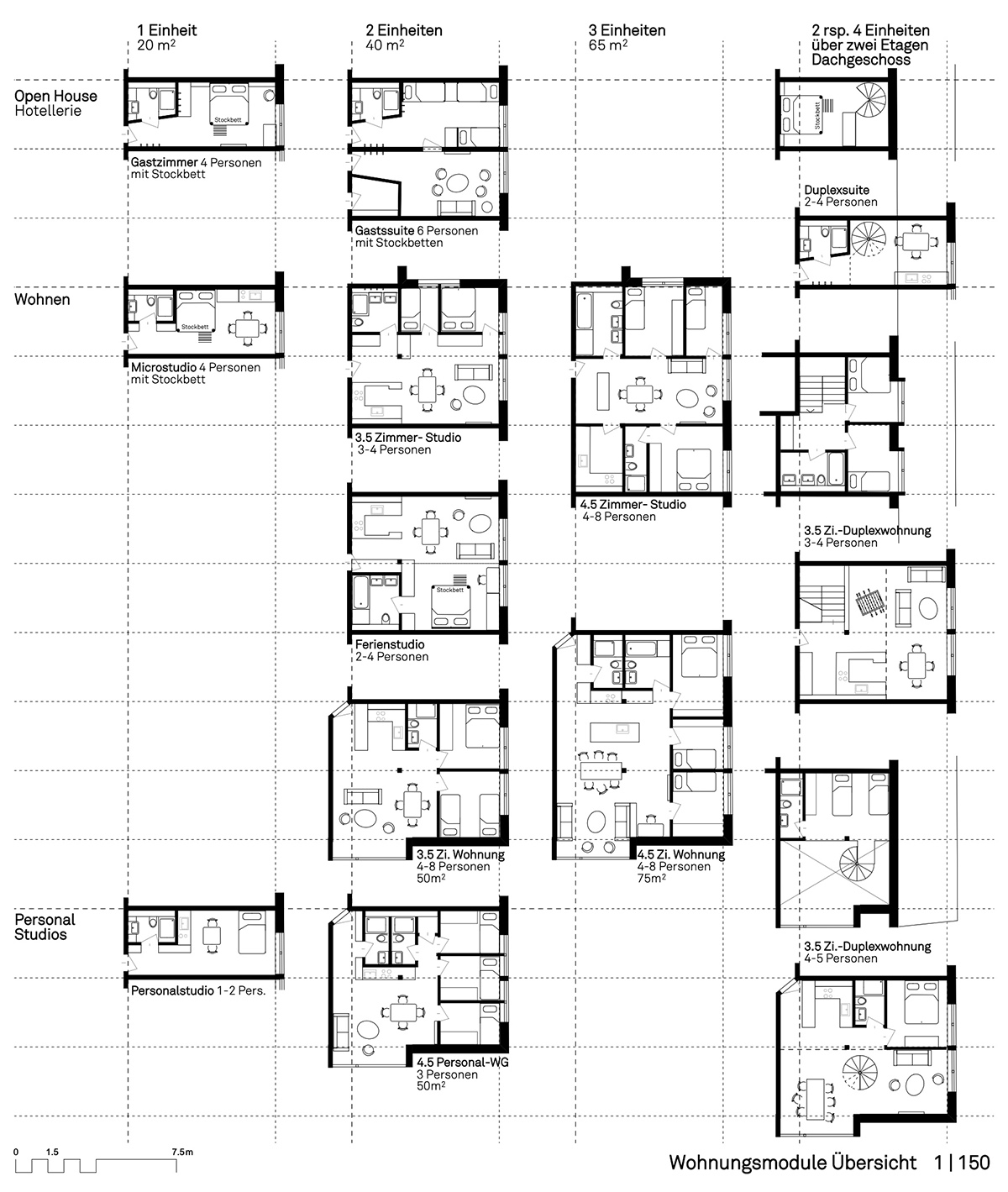Die zwei Baukörper erinnern mit ihren Giebeldächern und Holzfassaden an traditionelle Dorfarchitektur, sind jedoch in ihrer Gestaltung sehr modern. Die Hotellerie im Inneren verfolgt ein junges, preisbewusstes Konzept, das sich an Familien und Gruppen orientiert. Wie für alle Nutzungen des „Open House“ gilt hier: Das Angebot ist eine bereichernde Ergänzung und keine Konkurrenz zu bestehenden Betrieben.