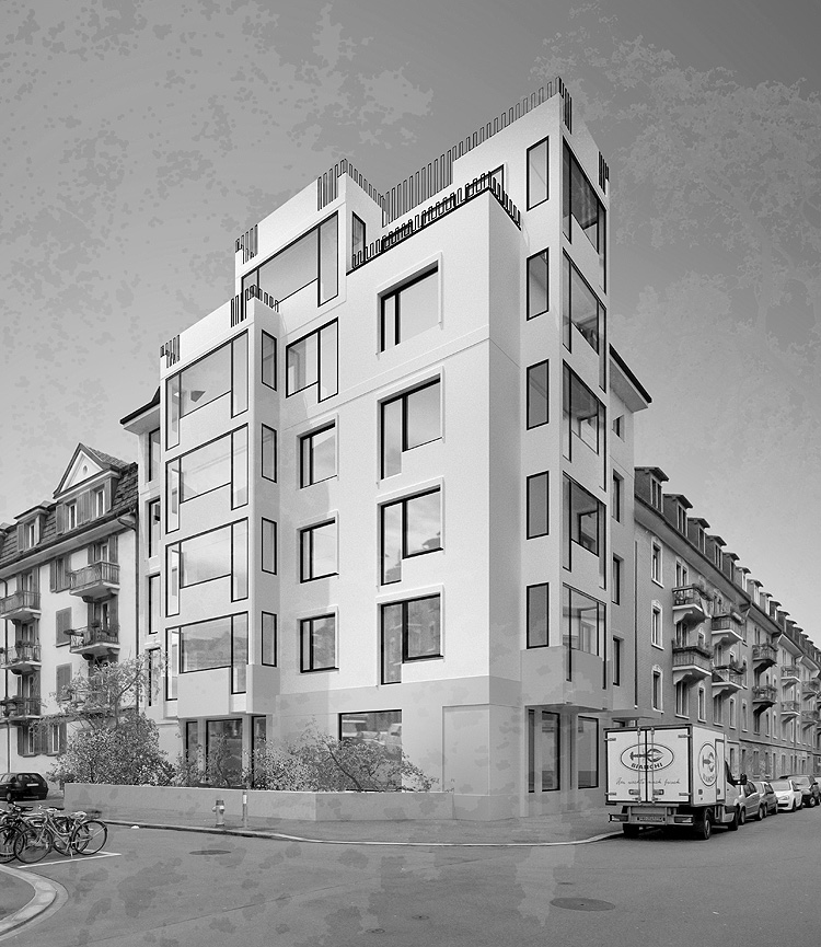 Das Jahrhundertwendehaus befindet sich an prominenter Ecke eines klassischen Zürcher Blockrands. Die Zonenordnung lässt eine Aufstockung um ein Vollgeschoss sowie das Vorhängen von Erkern zu. Der Entwurf setzt dem Bau ein neues, stark ausformuliertes Vollgeschoss und Dach auf. So entstehen zwei neue Duplexwohnungen mit je eingenem Dachterrassenteil. In der Tradition klassischer Bauten des Zürcher Kreis 3 wird das neue Geschoss mit einem sich von den unteren Geschossen unterscheidenden Thema akzentuiert. Die Diagonalstreben erinnern an traditionelle Fachwerke, zeigen aber zugleich auf moderne Art die Holzkonstruktion des neuen Dachaufbaus. Im Erdgeschoss werden die Parkplätze vor dem Haus aufgehoben und wieder zu Vorgärten umgewandelt.