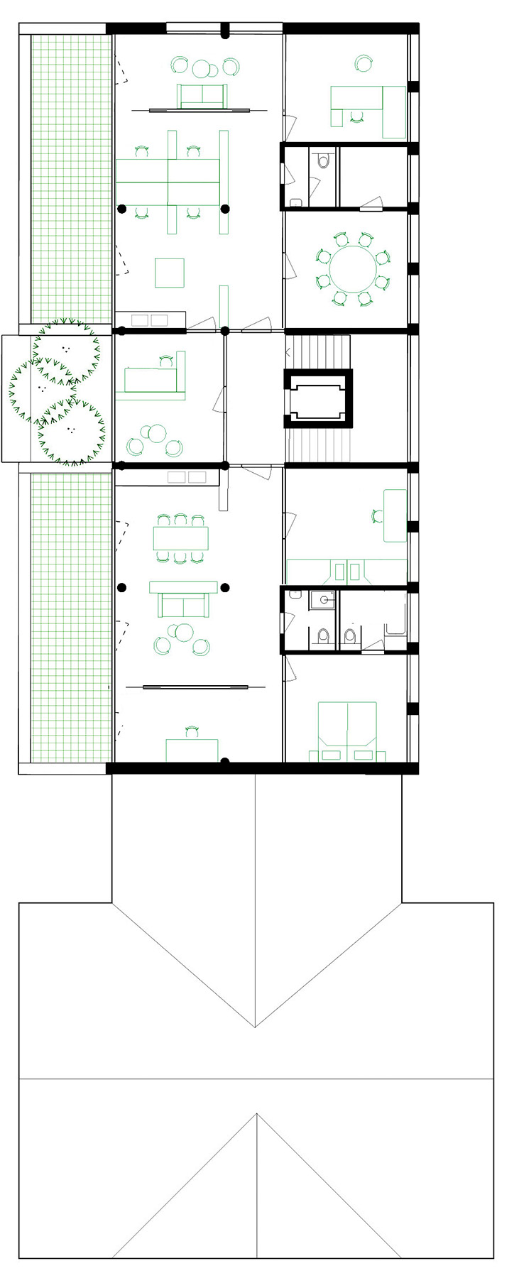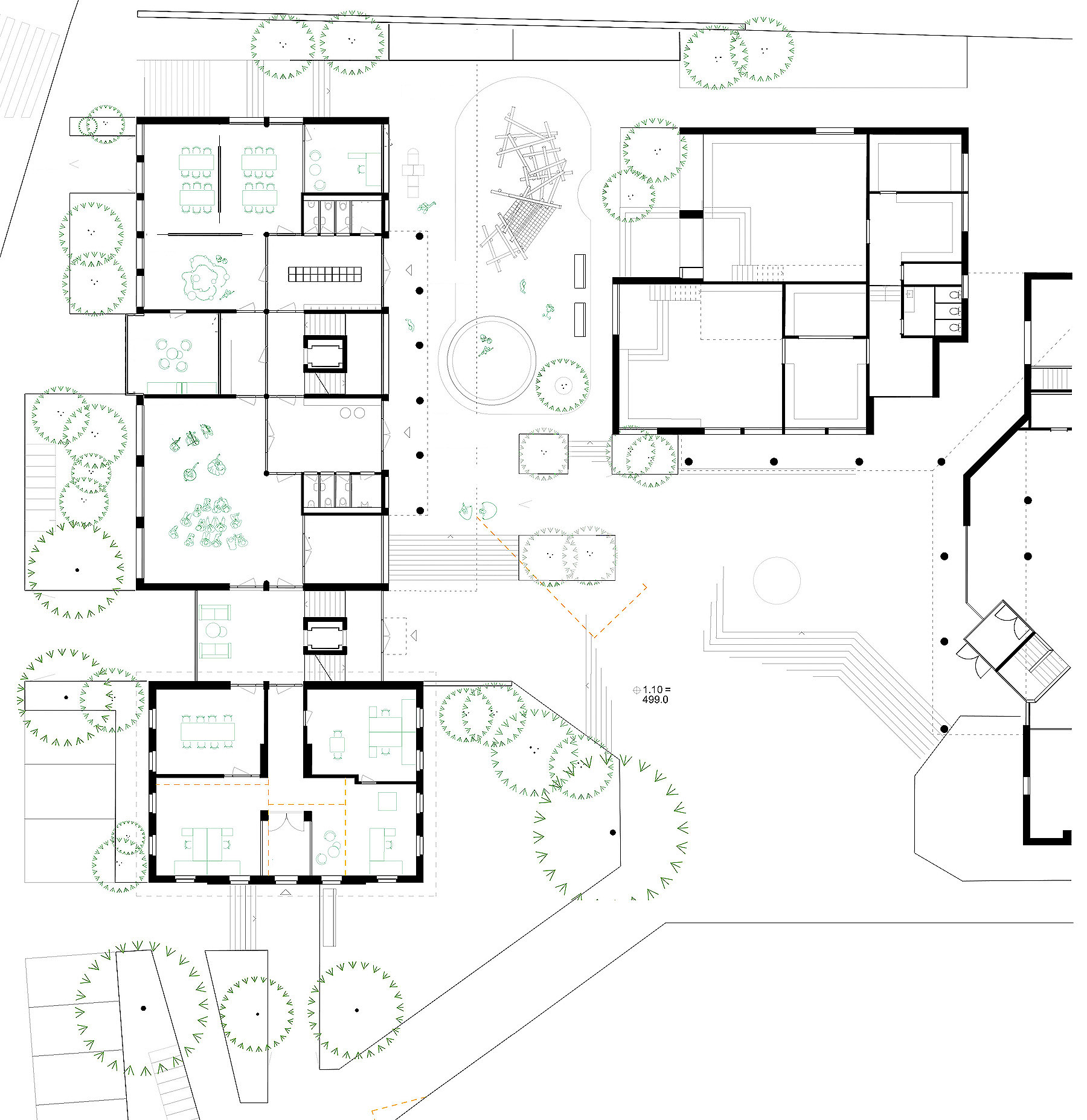 Der bestehende Kopfbau ist und bleibt Adresse der Gemeindeverwaltung Ballwil. Seine historische Substanz wird sensibel saniert. Dem historischen Bau wird ein flexibler «Alleskönner» zur Seite gestellt – oder besser: als Rucksack hinten angehängt. Die Strassenseite wird zur Adresse für die internen Nutzungen. Der Freiraum zwischen Neubau und bestehender Mehrzweckanlage wird zum Spielplatz. Was «Flexi» auszeichnet, ist seine programmatische Flexibilität. Der im Grunde symmetrisch aufgebaute Erweiterungsbau bewältigt mit derselben (lediglich gespiegelten und gestapelten) Grundrisseinheit alle gewünschten Nutzungen. «Flexli» ist auch in seiner Konstruktionsweise sehr flexibel und nachhaltig: Stützen und Decken sind betoniert um die Grund- risse möglichst flexibel gestalten zu können. Fassaden und Innenausbau bestehen aus vorgefertigten Holzelementen. Diese sind ökologisch nachhaltig, weisen ideale Aussendämmwerte auf (Minergie) und sind in Zukunft bei möglichen Umbauten und Sanierungen leicht zu ersetzen (und zu recyclieren). Nachhaltigkeit bedeutet für «Flexli» nicht nur ein CO2- und verbrauchsarmer Betrieb. Die flexiblen Grundrisse und Kon- struktionsweisen schaffen auch einen sozial nachhaltigen Bau: Der Bau gibt der Gemeinde Ballwil, seiner Verwaltung und den Schülern, eine ideale Hülle für Ihre Bedürfnisse und Entwicklung. Darüber hinaus lässt sich der Bau künftigen, veränderten räumlichen Bedürfnissen leicht anpassen.