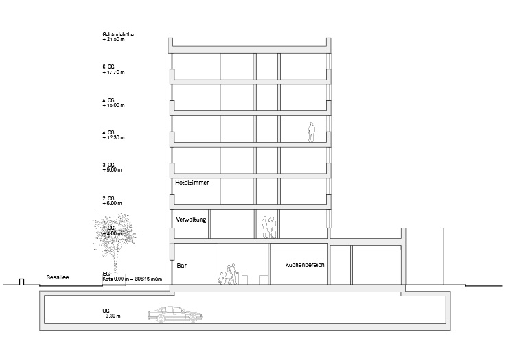 Dependance des Hotel Park Heiden mit Neugestaltung der Seeallee. Die ortsbauliche Haltung und das Erscheinungsbild leiten sich aus dem vorhandenen Ortsbild ab. Klare Orthogonalität in Grundriss und Ansicht sind die prägenden Gestaltungsprinzipien Heidens und der Seeallee. Die Aussenfassade nimmt mit ihrer weiss lackierten Holzverschalung traditionelle regionale Bilder auf. Der achtgeschossige Bau ist als Holzingenieurskonstruktion konzipiert. Das Innere wird durch die sichtbare Holzstruktur im Wechsel mit weissen Putzflächen geprägt und verleiht dem Bau ein warmes und modernes Interior.
