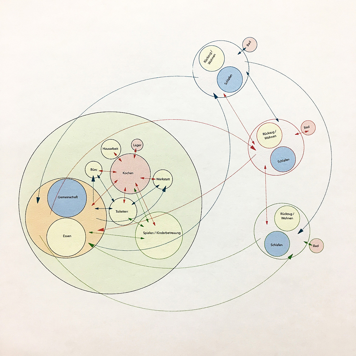 In einer ersten Übung analysierten die Studierenden das Zusammenleben und die Wohnformen einer uns möglichst fremden Gesellschaftsform: eine indigene Gruppe, zum Beispiel die Yanomami Indianer Südamerikas, der Massai in Ostafrika. In einer zweiten Übung wurde überlegt, wie deren Zusammenleben ein Vorbild für moderne Arten des verdichteten nachhaltigen Zusammenlebens bei uns sein könnten: neue Formen von Wohn- und Arbeitsgemeinschaften die bei uns funktionieren könnten, aber Wohngrundrisse benötigen, die es bisher nicht gibt. Zunächst wurde die Idee in einem Wohndiagramm notiert. In der letzten Übung in einem «passenden» Wohngrundriss umgesetzt. Enstanden sind spannende Ansätze welche die kollektive Nutzung von Infrastrukturen - vom Wohnen und Essen über das Bad bis hin zum Schlafzimmer durchdenken.