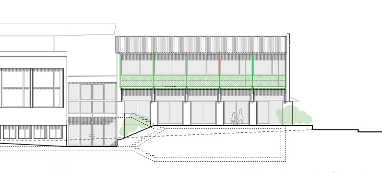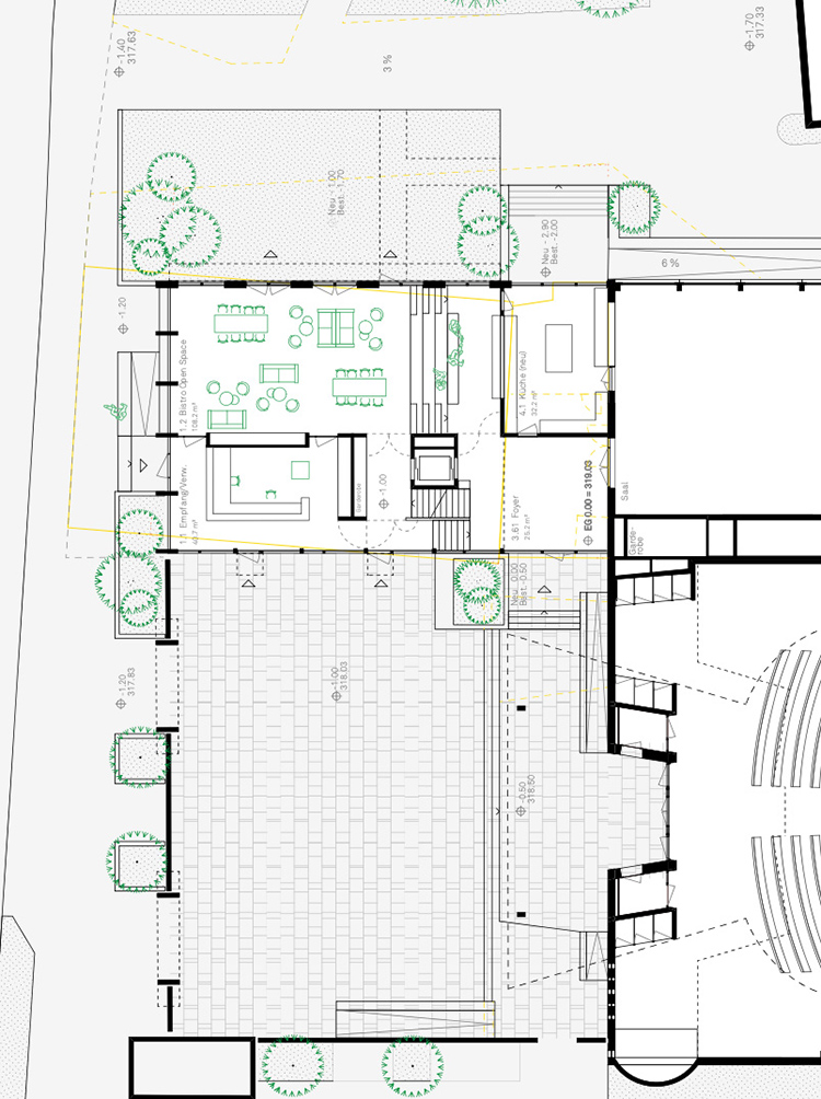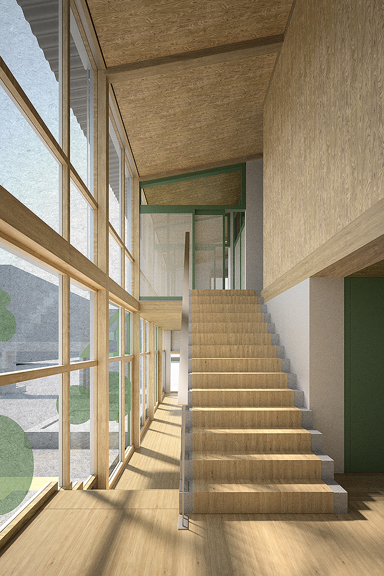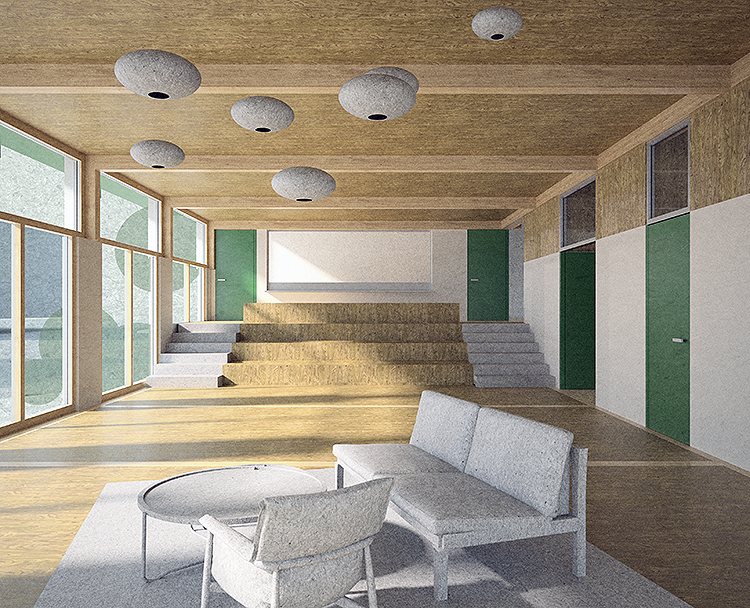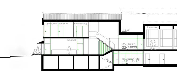 Entgegen seinem Namen schlägt das Projekt «Elefant» ein möglichst kleines Bauvolumen vor. Das gesamte oberirdische Volumen ist als Holzbau konzipiert, zum Teil aus fertigen Wandelementen, zum Teil als Stabwerk. Kein hermetisches Konzept - eher konstruktive Spielwiese – ganz wie eine Kirchgemeinde funktionieren sollte.Folgerichtig zeigt sich das Projekt zu allen Seiten offen, lädt zum Eintreten ein. Im Inneren fliessen die Räume, können mit grossen Türen verbunden oder getrennt werden.