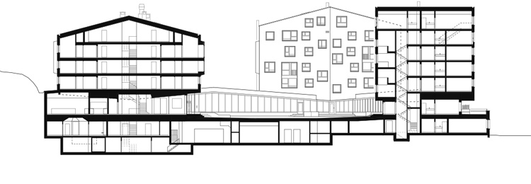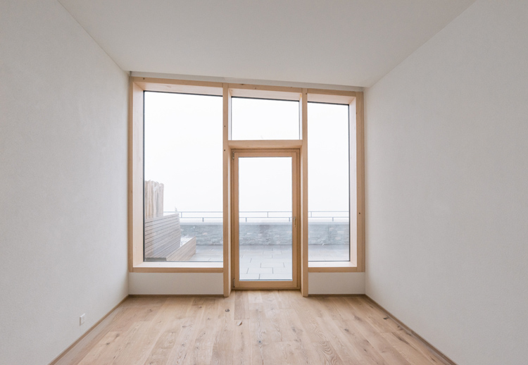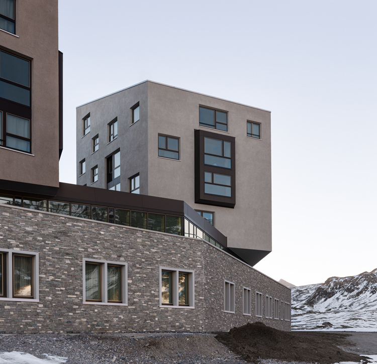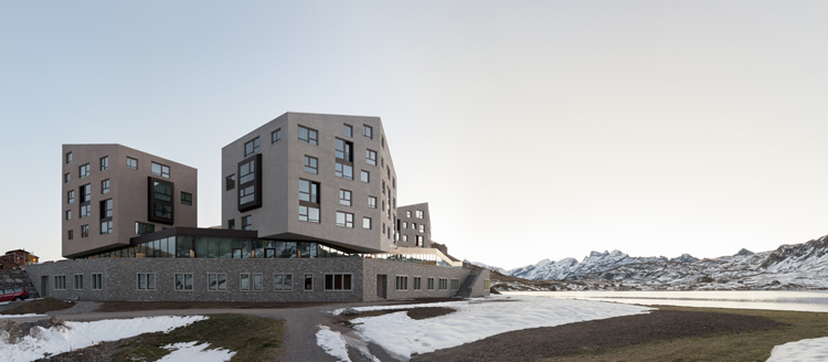 Der Neubau «Frutt Family Lodge & Melchsee Apartments» liegt am Obwaldner Melchsee auf rund 1900 Metern über Meer. Das Vier– Sterne– Hotel mit 47 Suiten und Zimmern sowie die 43 Ferienwohnungen sind auf vier Baukörper verteilt. Sie markieren als Schlussteine den Übergang des Ortes zum See. Die Architektur nimmt die ortsübliche Bauform des freistehenden Giebelhauses auf und lehnt sich an Berghütten an. Jedoch scheinen die schweren Baukörper über dem verglasten Sockelbau zu schweben.