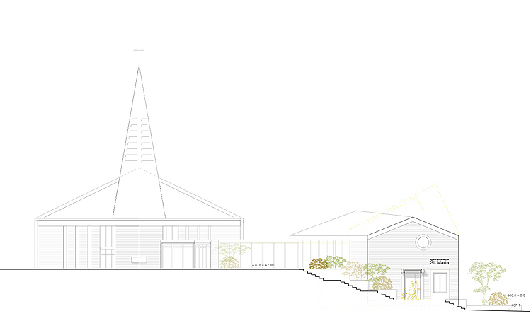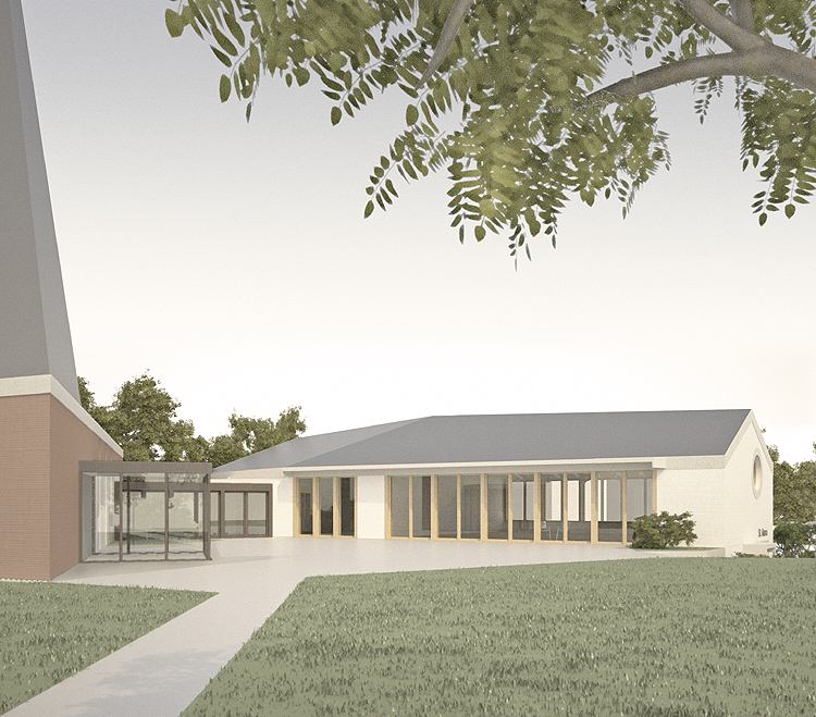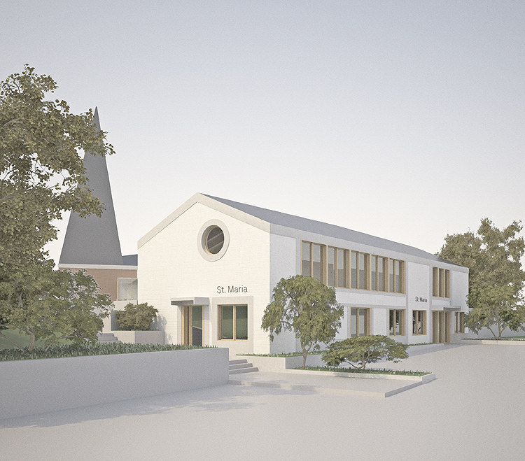 Wettbewerb, 2016 | Symbolisch und räumlich stehen sich Kirche und neuer Gemeindesaal gleichberechtigt gegenüber. Sie bilden einen sozialen und spirituellen Raum, der durch die Gemeindemitglieder zu Leben erweckt wird.