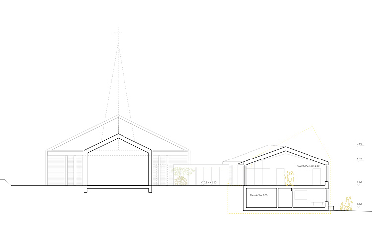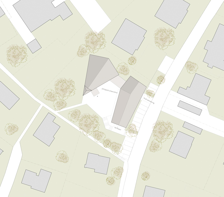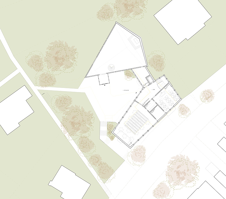 Das Projekt nimmt die ortsbauliche Setzung des Vorgängerbaus auf: Die Verbindung der beiden Terrainniveaus mit dem Gebäude, der halboffene Hof und der Treppenaufgang mit Ausrichtung auf den Kircheneingang werden als Qualität erkannt. Während sich auf Strassenniveau neu die Verwaltungsräume befinden, sind der Saal, der Unterrichtsraum und alle dazugehörigen Räume auf dem Niveau des Kirchenbaus untergebracht. Die Verwaltung ist auf Strassenniveau einfach zugänglich und verdeutlicht die Offenheit der Kirchgemeinde. Der Saal auf Niveau Kirchenbau versteht sich in räumlichem und symbolischem Bezug zu diesem. Respektvoll tritt der Neubau dem Kirchenbau eingeschossig gegenüber. Gemeinsam spannen beide Bauten einen offenen und dennoch geborgenen Aussenraum auf: Platz für das Besammeln vor und nach dem Gottesdienst und zugleich für Anlässe und Feiern.