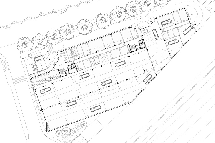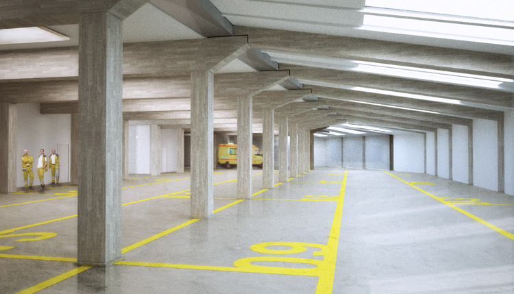 Im Erdgeschoss befindet sich die grosse Einstellhalle der Rettungsfahrzeuge. In den ersten zwei Obergeschossen liegen die Mannschaftsbereiche mit den Garderoben und den Räumen für den Aufenthalt und die Administration. Die darüberliegenden Etagen der optionalen, zweiten Bauetappe sind für fremde Nutzer vorgesehen.
