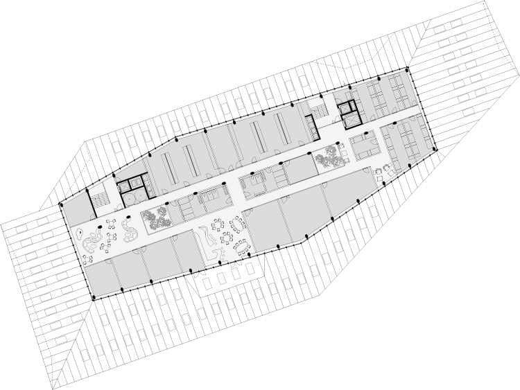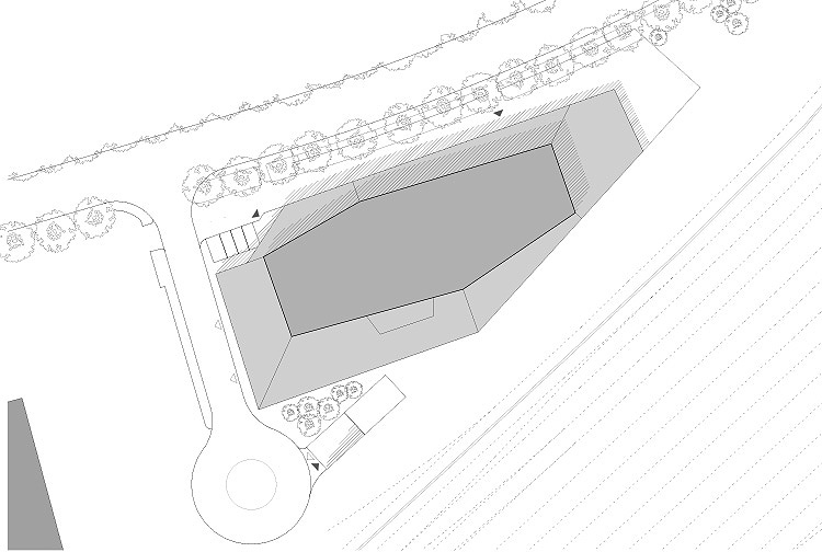 Der Baukörper bildet eine ikonografisch einprägsame Bauform am Stadtrand Berns. Die charakteristische Gebäudeform verleiht den oberen Geschossen räumliche Distanz zu Strasse und Gleisanlagen und ermöglicht die natürliche Belichtung grosser Erdgeschossbereiche mittels Dachfenstern. Die innere Struktur ist als Holzbau mit Fertigelementdecken gedacht, im Erdgeschoss tragen grosse Binder. Die Fassade selbsttragen wie eine metallische Pfosten-Riegel-Konstruktion, aber ebenfalls ins Holz.