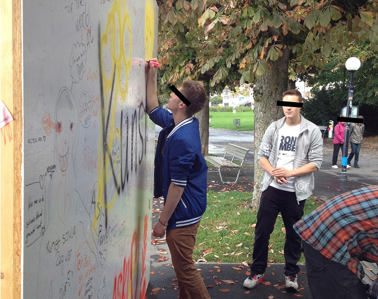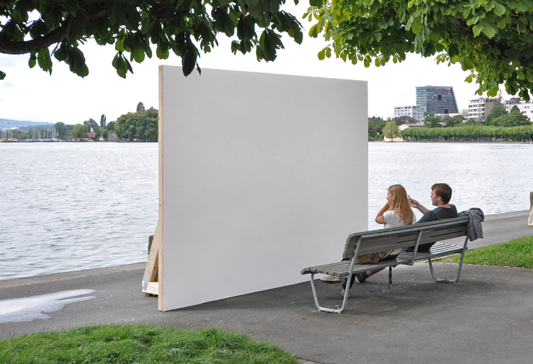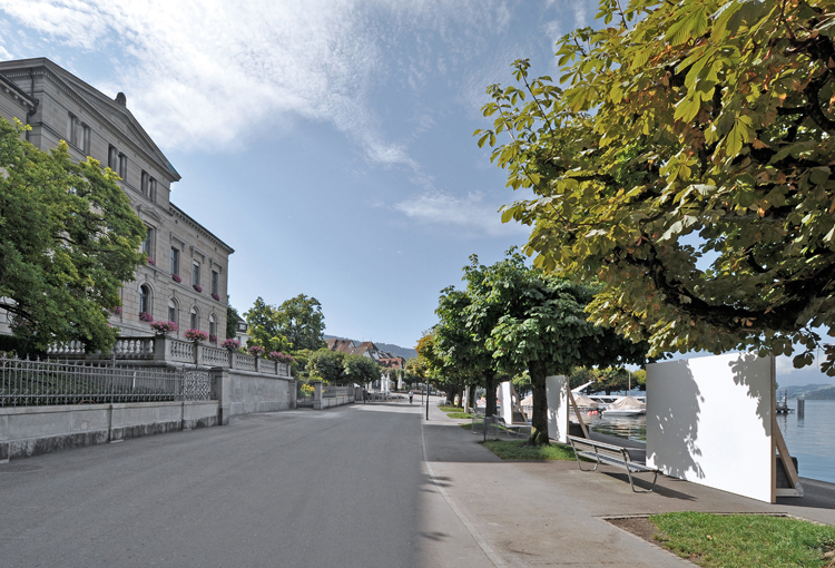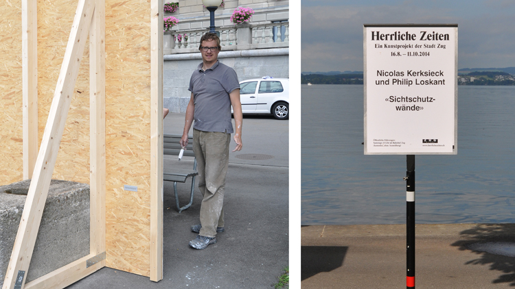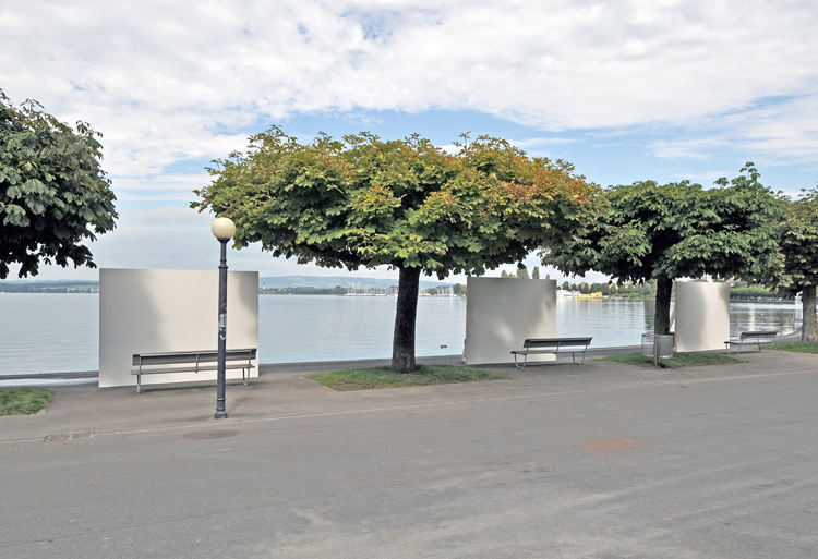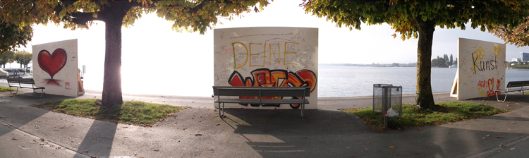 Im Rahmen des urbanistischen Kunstprojekts «Herrliche Zeiten» der Stadt Zug wurden die Aussichten der Seepromenade mit drei Wänden zu-g-ebaut. Vis-à-vis des Regierungsgebäudes, dort wo sonst der Blicke über die herrliche Weite des Sees gleiten kann, verbauten für einige Wochen weisse Wände die Sicht. Schön anzuschauen, aber dennoch fatal für Aussicht und Naturerlebnis – so wie die zahlreichen Neubauten, die das Zugerland und andere Seelandschaften zunehmend verbauen. Im Laufe der Zeit eigneten sich Jugendliche die weissen Flächen an und nutzten diese für ihren eigenen Parolen.